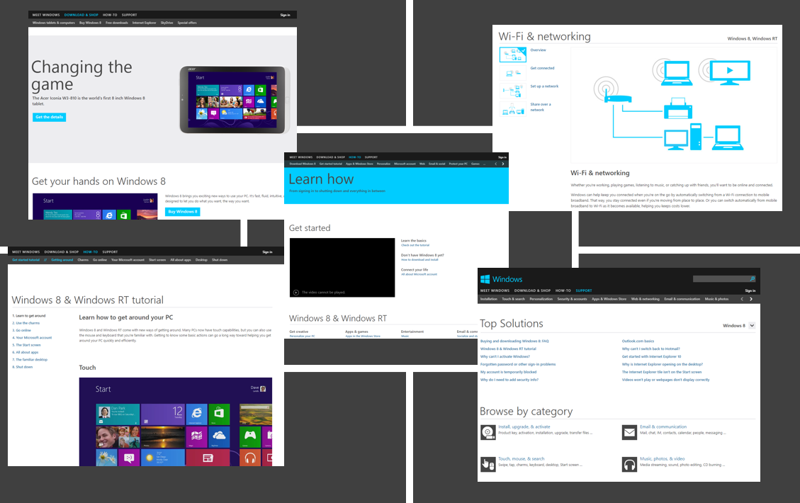 For Windows 8, I led the entire content team, inclusive of writers, editors, and videographers. In a tight partnership with UX, Marketing, and engineering, we produced the UI, assistance, video, marketing, merchandising, and support content. We reimagined the content model for learning—focusing on scenario-based modules and leaning into video—and used data to reduce the overall Help content set by 80+%, significantly driving down spend.